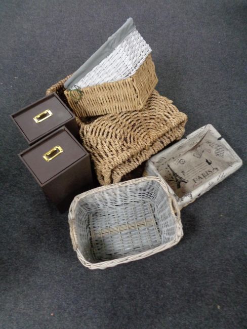Two index drawers and a quantity of wicker baskets