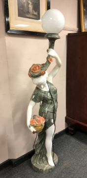A pair of marble floor lamps modelled as maidens holding flowers, height 165 cm