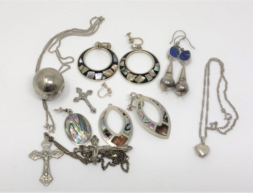 A group of mostly silver jewellery comprising a pair of lapis lazuli earrings, two pairs of abalone earrings plus another single, heart locket, chains etc