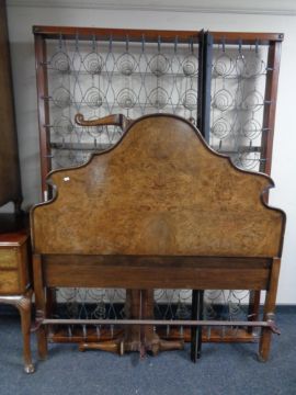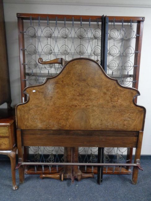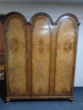 A four piece Palatial Furniture walnut bedroom suite comprising of triple door dome topped wardrobe, five drawer dressing table on cabriole legs (lacking mirror), linen chest and 5' bed frame with Silex box spring