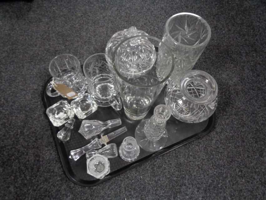 A tray of assorted glass ware and lead crystal including tankards, vases, decanter stoppers etc