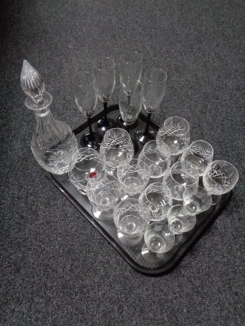 A tray of assorted glass ware including decanter, two tone champagne flutes, Royal Albert brandy glasses