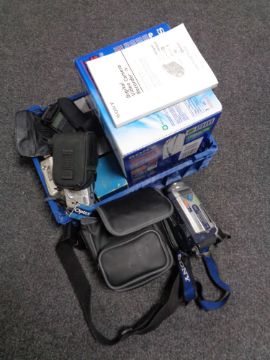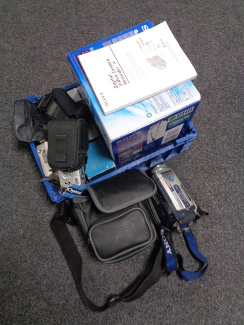 A crate of cameras to include Sony Handycam, cameras, Ricoh KR-10 etc