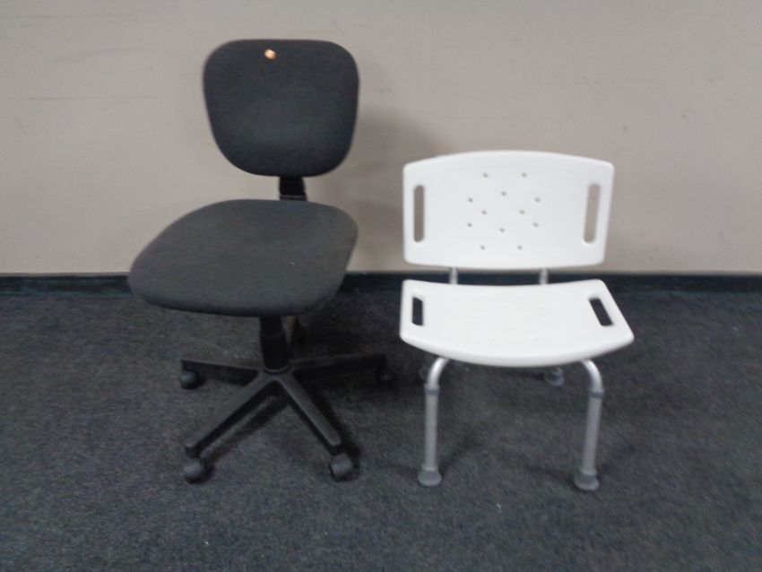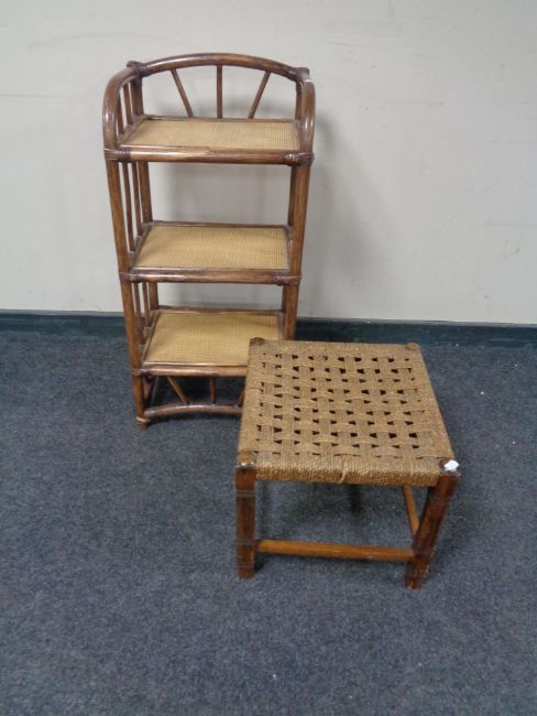 A swivel typists chair, a bath chair, rush seated stool and a bamboo and wicker three tier stand