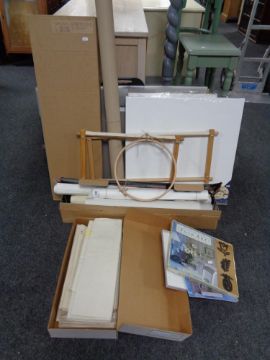 A quantity of artists's equipment including folios, canvases, stretchers, art books with stamps etc