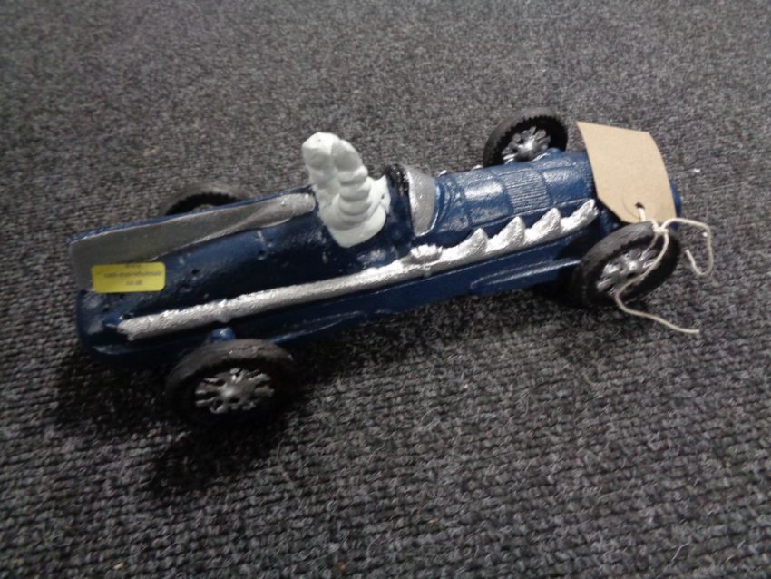 A cast iron figure modelled as a blue Michelin racer