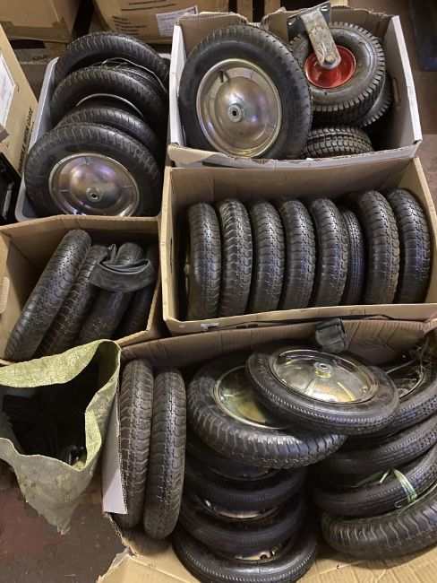 A pallet of assorted sack barrow and trolley wheels, inner tubes