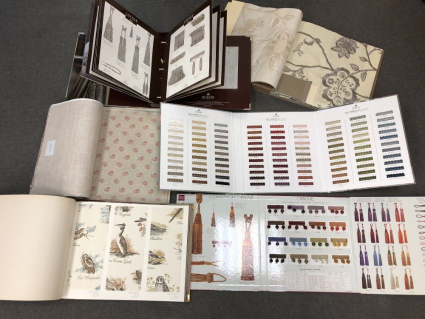 A collection of thirty two interior designer's fabric and wallpaper sample books : Andrew Martin 'Navigator' (Wallpaper), Harlequin 'Arkona' (Fabric), Wemyss ' Ripple' (Fabric), Osborne & Little 'Kintyre Plains' (Fabric), Edinburgh Weavers 'Hidden Secrets' (Fabric), Isle Mill Embroidered Silks (Fabric), Houles ' Lounge Collection' (Trimmings), Houles 'Lezarde (Trimmings), Harlequin 'Arabella' (Trimmings), Camengo. 'Abracadabra' (Fabric), Wemyss. 'Galileo' (Fabric), Wemyss 'Diva' (Fabric), Wemyss 'Thor' (Fabric), Wemyss 'Crystal' (Fabric), Wemyss 'Kentia' (Fabric), Kai 'Asina' (Fabric), Troynoth 'Daisy Chain' (Trimmings), Houles 'Naomi' (Trimmings), Houles 'Opaline' (Trimmings), The Handsome Trimming Company 'Tango' (Trimmings), Houles 'Double Cord et Galons Collection' (Trimmings), Warwick. 'Contract Fabric Book Collection' (Fabric), Isle Mill 'Seta Grezza' (Fabric), Isle Mill 'Tamia' (Fabric), Warwick 'Cabra' (Fabric), Sanderson 'Elyan' (Fabric), Kate Forman 'Book 1' (Fabrics), Kate Forman 'Book 2' (Fabric), Lewis & wood. 'Sporting and Character' (Fabrics and Wallpapers), Design Forum 'Albany' (Fabric), Houles 'Cordoue' Hanger' (Fabric) & Casadeco 'Opale' Hanger (Fabric). (32)