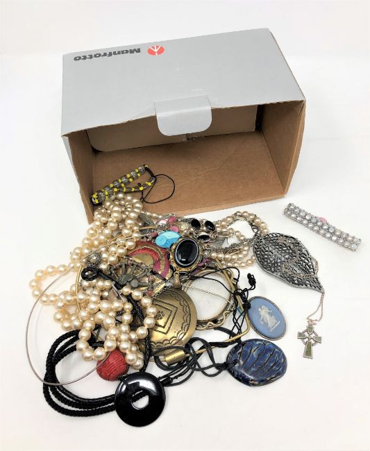 A silver Celtic crucifix pendant on chain, together with a quantity of costume jewellery, Pinchbeck mourning locket etc
