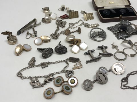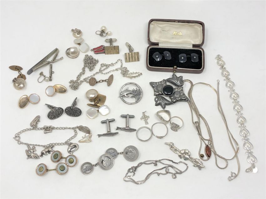 A collection of silver jewellery, chains, rings, costume jewellery including cuff links etc (Qty)