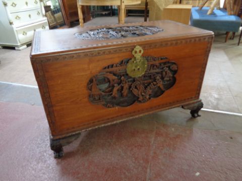 A carved oriental camphor wood blanket box