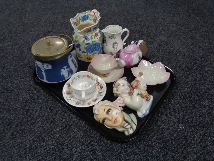 A tray of ceramics including lidded biscuit barrel, Masons Regency jug, Italian chalk wall plaque, pink and white lustre shell tea cup and saucer etc