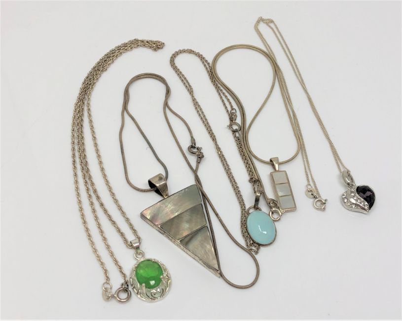 Five silver pendants on chains (5)