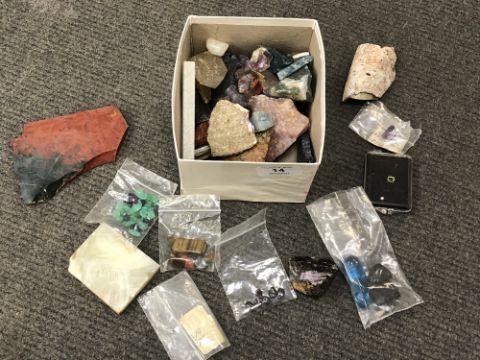 An interesting collection of rocks, polished stones, minerals, mother-of-pearl, etc. (Q)