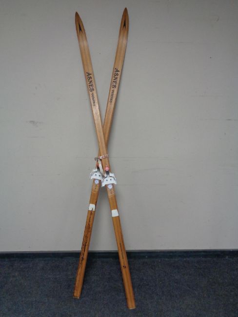 A pair of wooden Asnes Veteran skis with binding