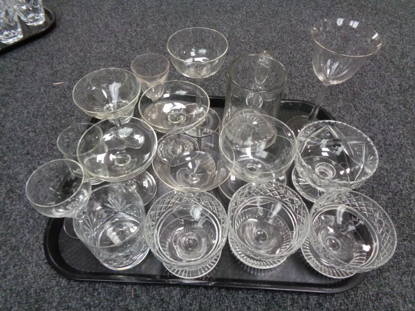 A tray of assorted glass ware to include tankards, dessert bowls, whisky glass etc