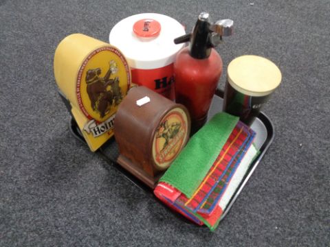 A tray of brewery items including Guinness Camerons strong arm and Hoffmeister large bar displays, Haig ice bucket, vintage soda syphon and bar mats