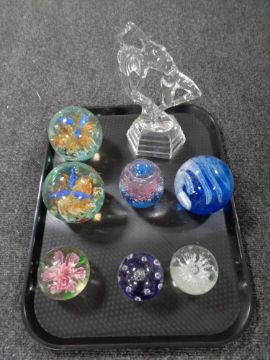 A tray of an Art Deco style glass figure together with seven further glass paperweights