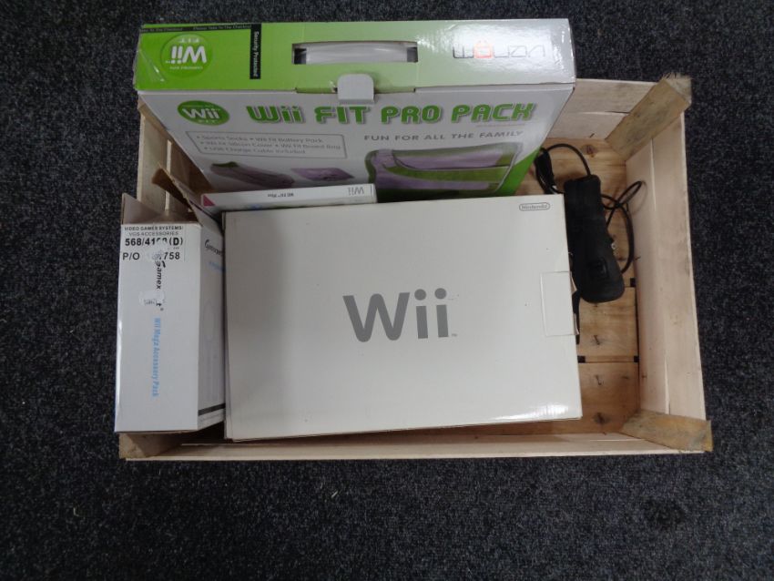 A boxed Nintendo Wii with leads and accessories, Wii Fit + and two boxed accessory packs