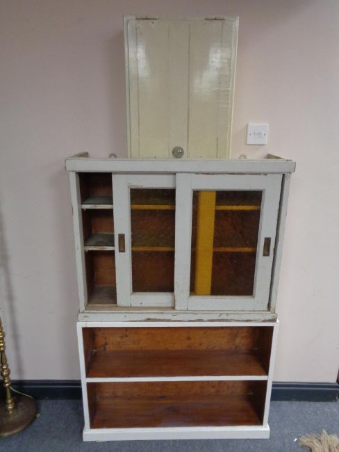 A set of painted pine open bookshelves together with an antique pine sliding glass door cabinet and a wall mounted bathroom cabinet