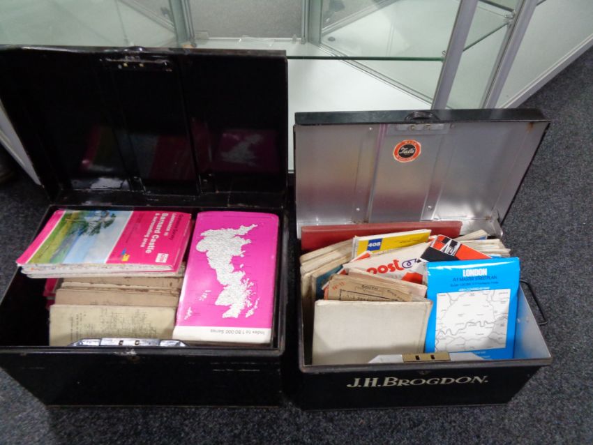 Two early 20th century metal deed boxes containing assorted folded maps