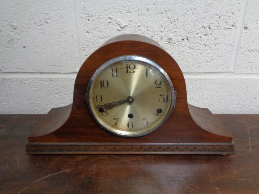 A 1930's walnut mantel clock with silvered dial