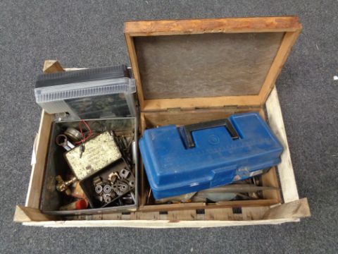 A box containing brass taps, hand tools, hardware etc