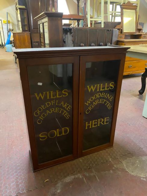 An Edwardian mahogany double door display cabinet bearing Wills Cigarettes advertising