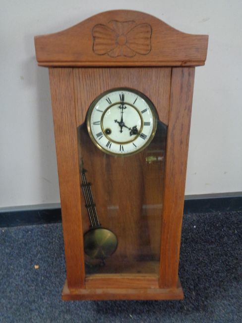 An early 20th century oak cased wall clock with brass and enamelled dial