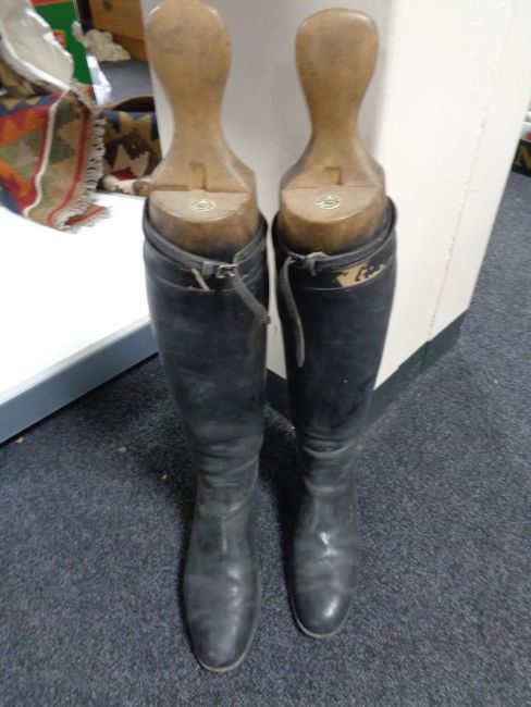 A pair of vintage leather riding boots with Peel & Co wooden boot stretchers