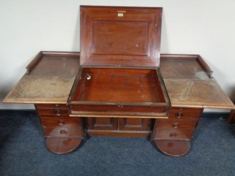 An unusual Victorian mahogany writing desk with tooled leather inset panel with fifteen drawers and cupboard beneath