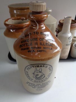 A tray of antique stoneware to include bottles, flagon, storage jars, bed warmer