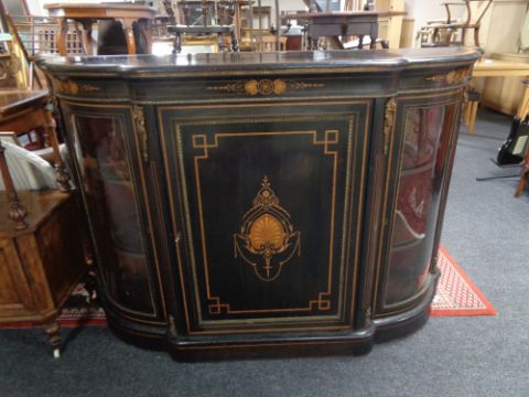 A Victorian ebonised, burr walnut and satinwood inlaid bowfront credenza with gilt metal mounts, with central panel door and curved glass side doors