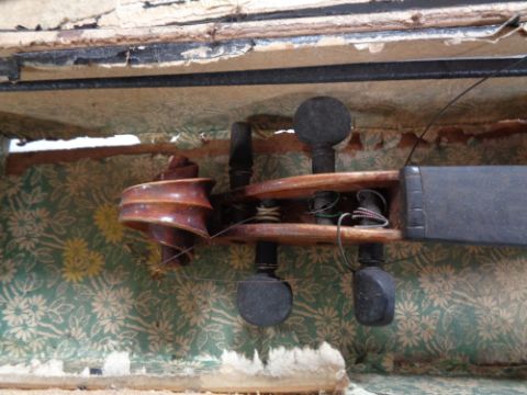 An early 20th century violin and bow in coffin case, needing attention, back length 33 cm.