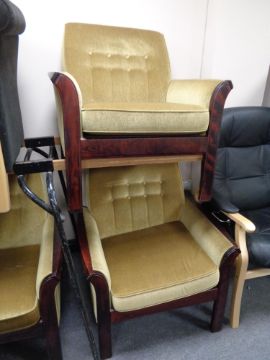 A late 20th century stained beech framed three piece suite upholstered in gold dralon