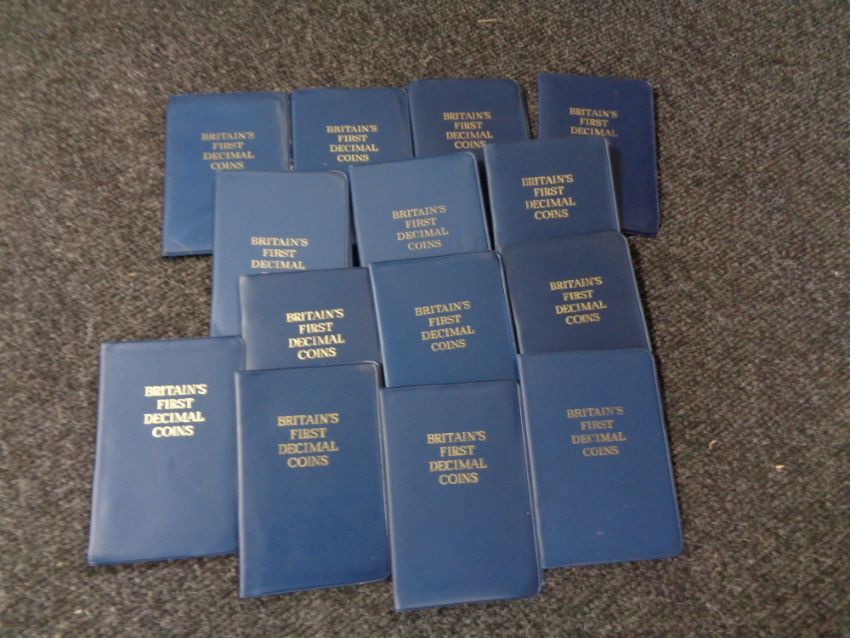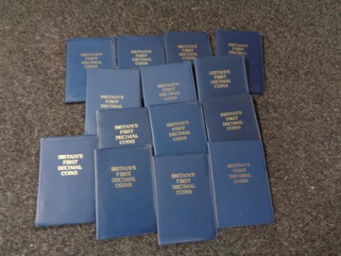 Fifteen Britain's First Decimal Coin sets in plastic wallets