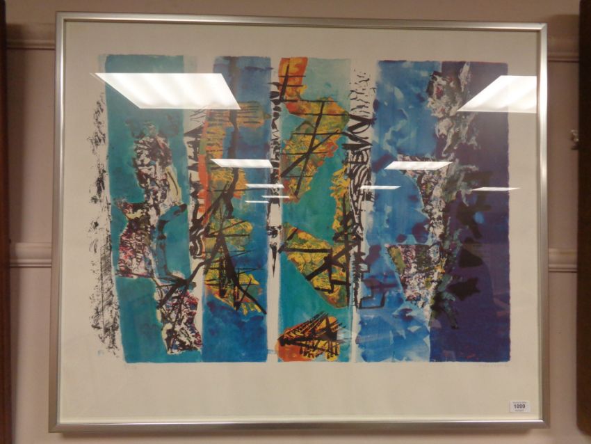 A mid century continental colour print, limited edition 9/250, indistinctly signed, framed.