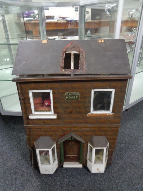 A mid 20th century doll's house titled 'Clayton House', containing a quantity of assorted dolls furniture 65 cm x 46 cm x 33 cm.