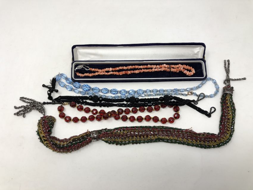 Assorted jewellery including coral necklace, bead necklaces, a miser's purse etc