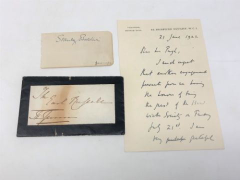 Three items relating to prime ministers comprising a letter to Earl Russell dated June 1873 from Windsor Castle with black royal seal, a letter dated June 1922 signed by Herbert Henry Asquith and a Stanley Baldwin signature dated January 1924.