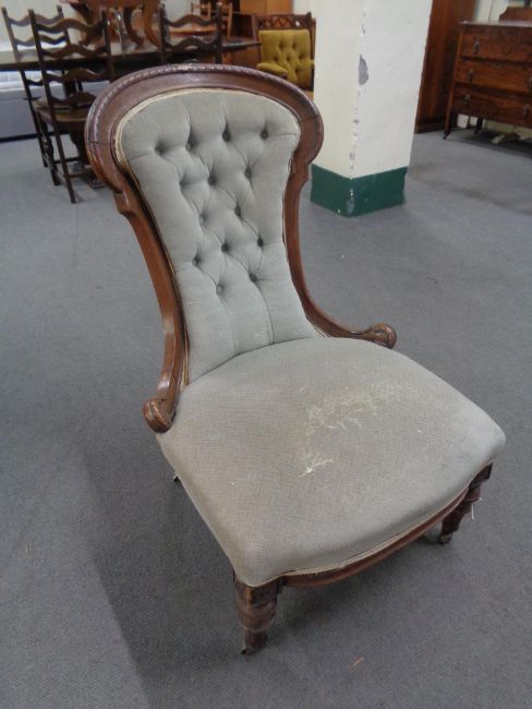 A Victorian mahogany lady's chair upholstered in buttoned fabric
