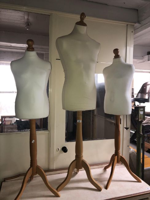 Three dress makers mannequins on stands