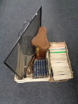 A box of model engineering magazines, wooden book trough, spark guard and fire bucket, leather bound volumes etc