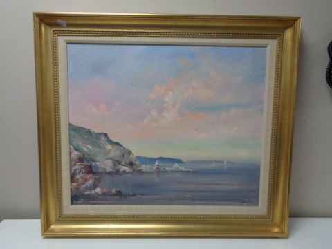A 20th century gilt framed oil on canvas, coastal landscape, indistinctly signed