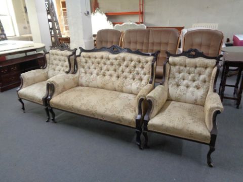 A three piece Edwardian mahogany framed lounge suite upholstered in floral tapestry covering