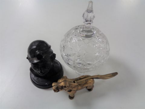 A vintage brass nut cracker in the form of a dog together with a polished coal figure of a miner and glass lidded dish