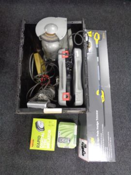 A box of assorted power tools to include bench grinder, cased hammer drill, jigsaw etc together with a Challenge cordless pole hedge trimmer