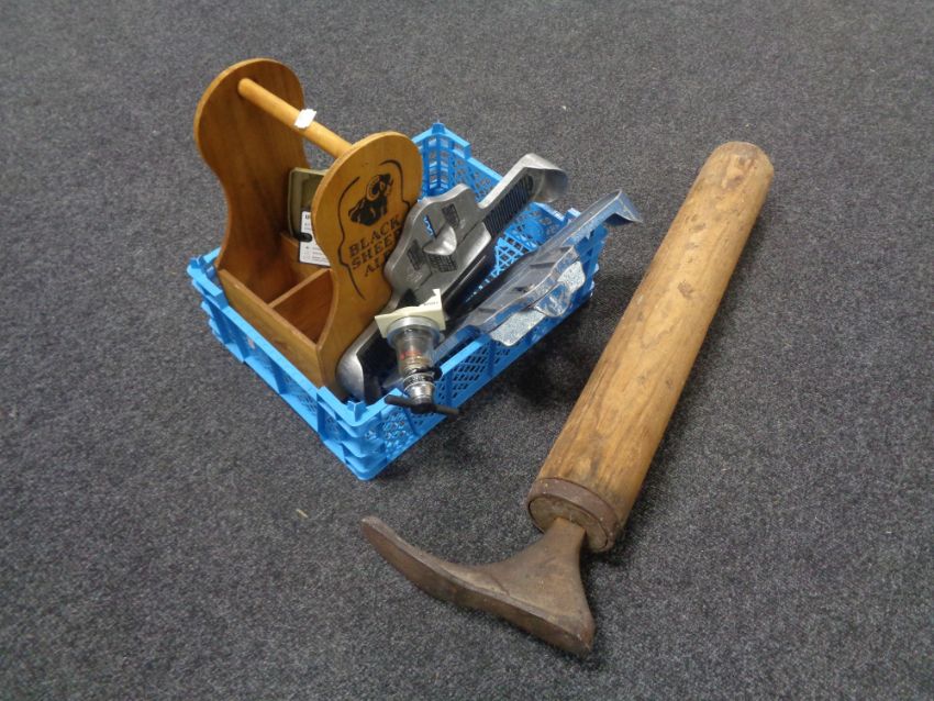 A crate of cobbler's last, two Brannock vintage foot measures, black sheep ale drinks caddy together with bar optics