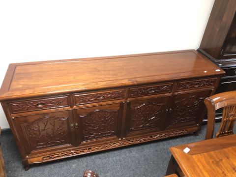 A good quality Chinese style dining room suite comprising four door sideboard, extending table with two leaves and ten dining chairs