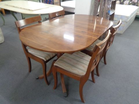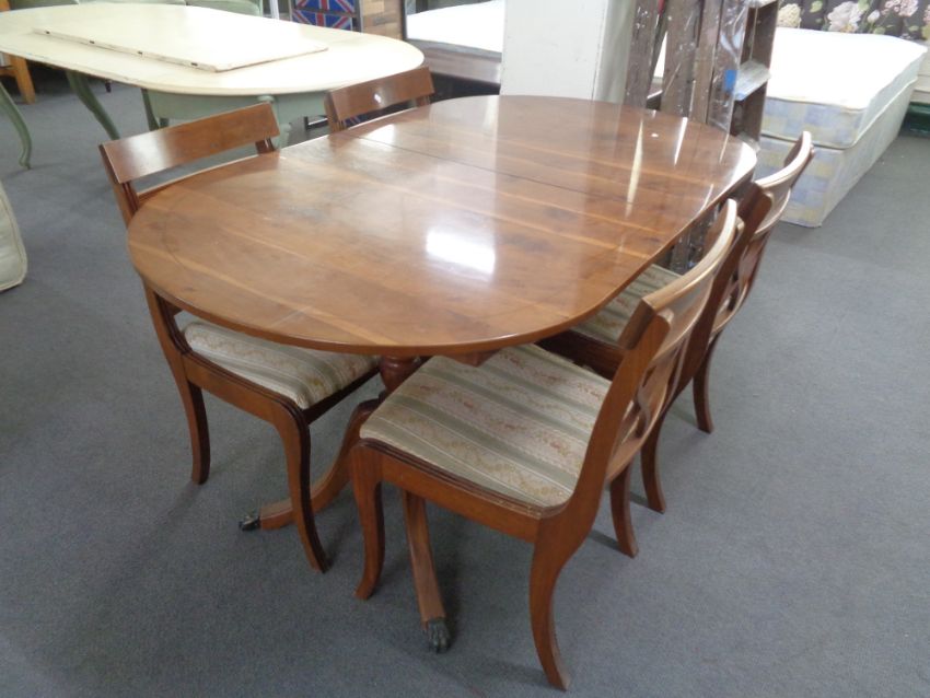 An inlaid yew wood twin pedestal dining table with four chairs